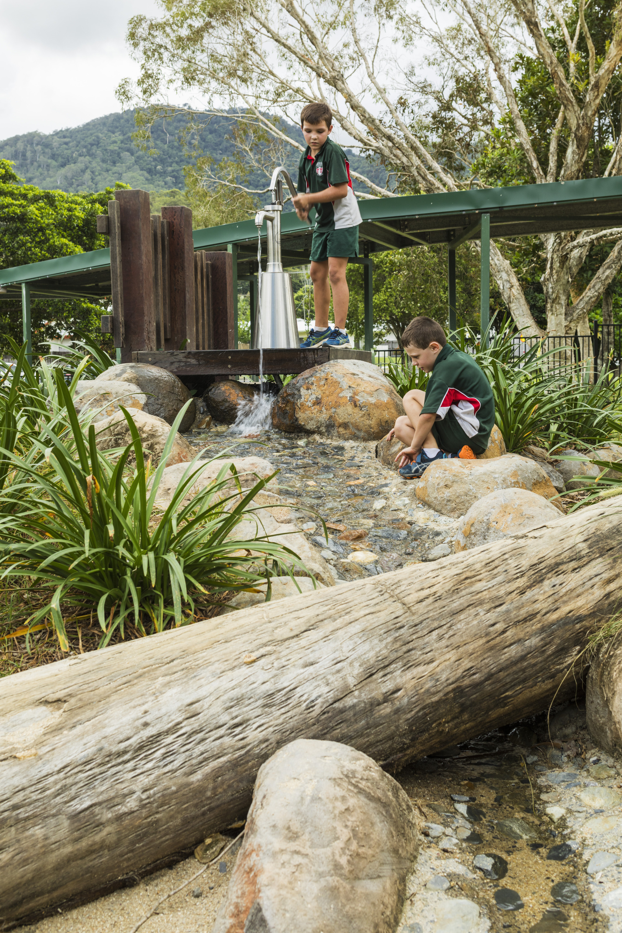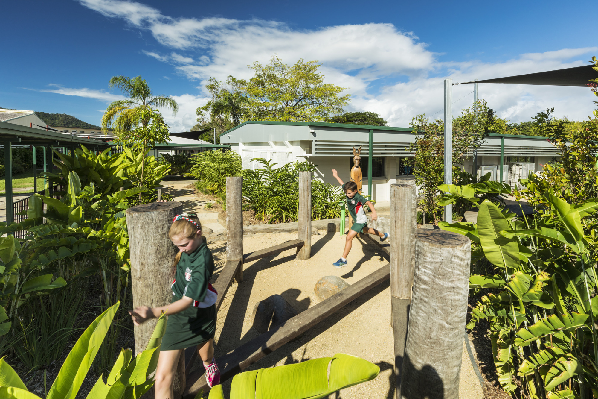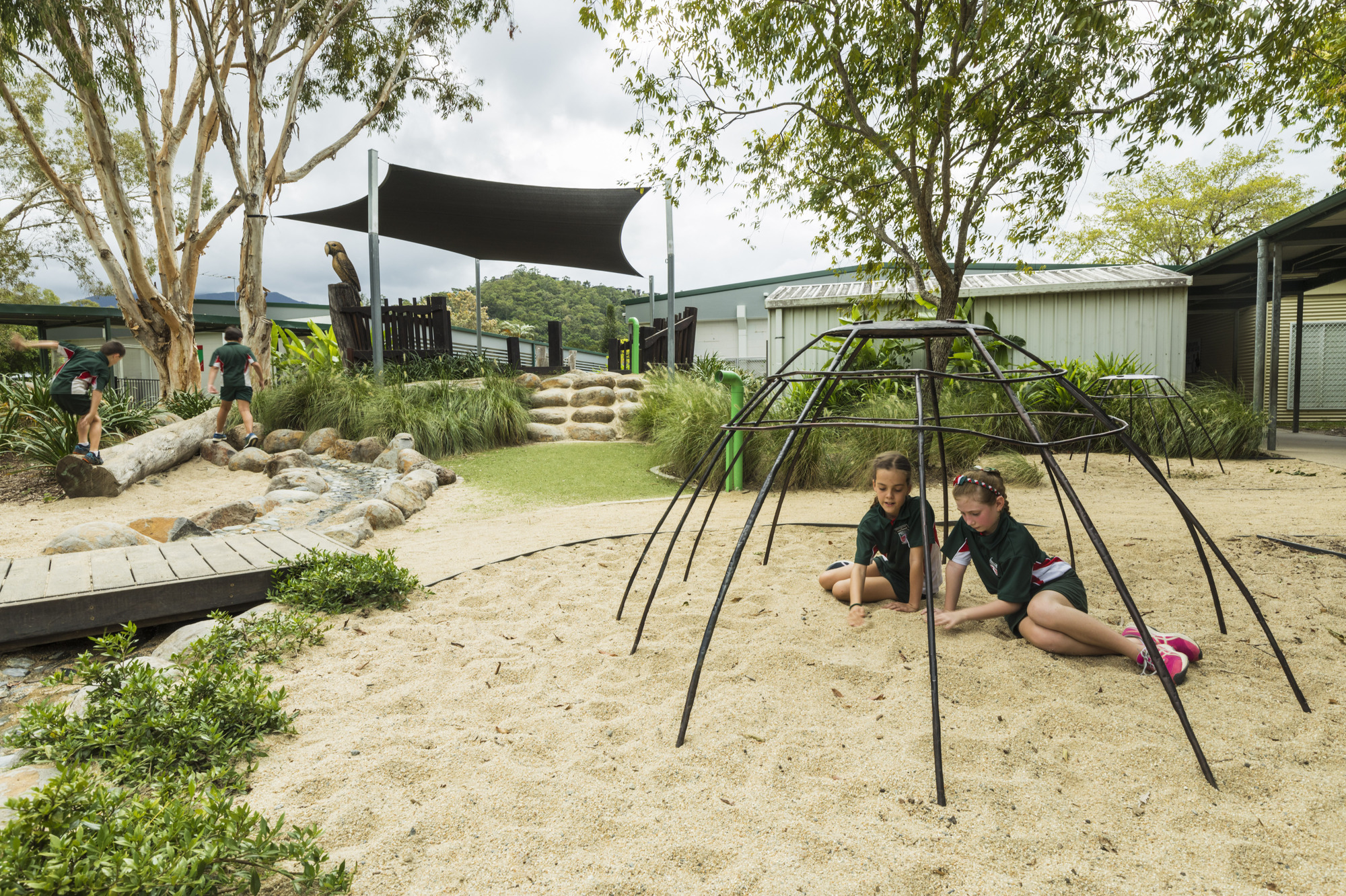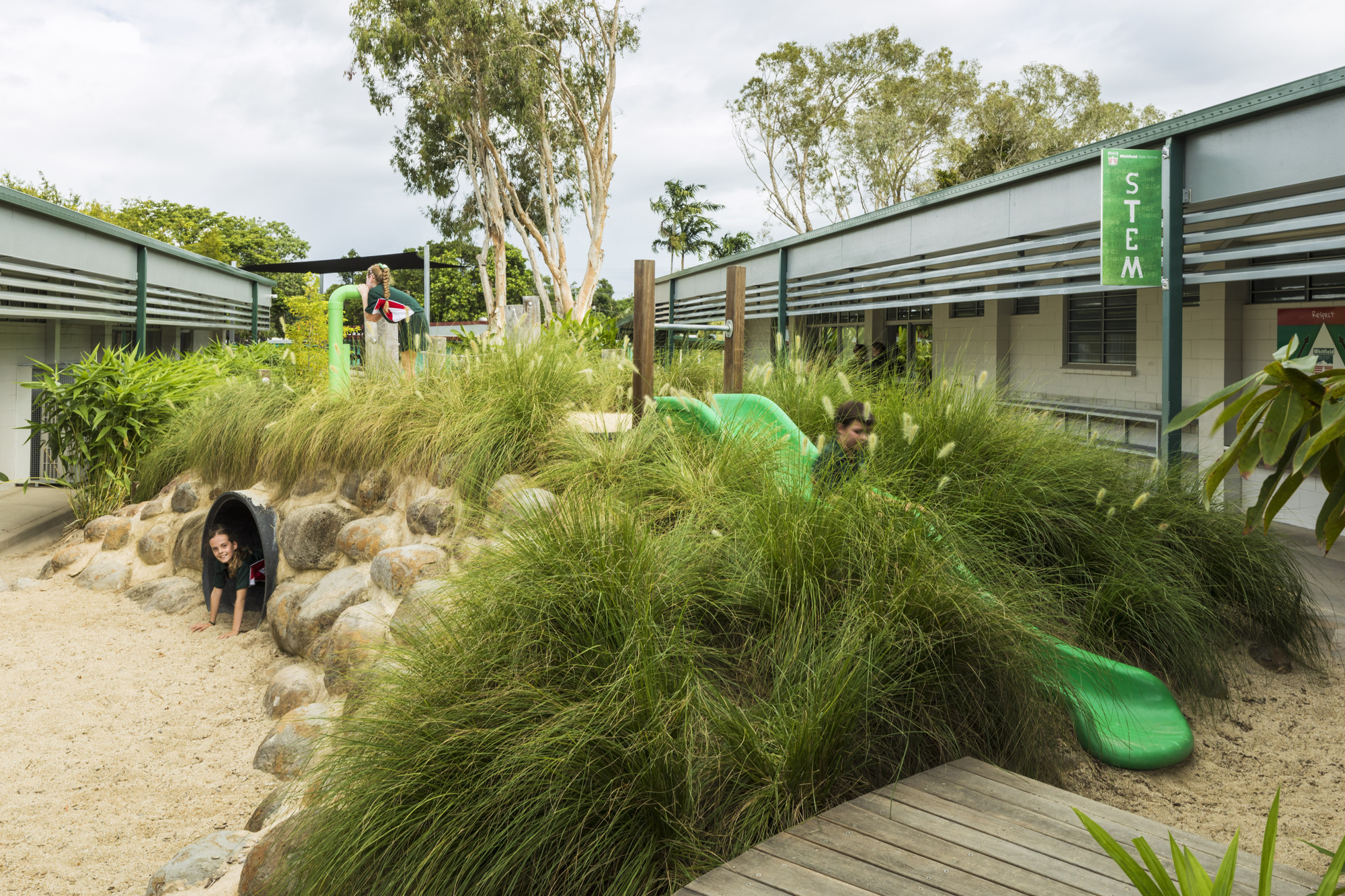 The Little Roo’s Playground builds on a short story created by the Whitfield State School teachers to assist children transition from preschool into prep. The narrative is brought to life with the creation of a series of play experiences featuring little Roo’s new friends, each character based on animals found in North Queensland. The outcome functions beyond the basic purpose of a playground, providing prompts for lessons on the natural environment, relationships, resilience and fostering environmental stewardship in later life.